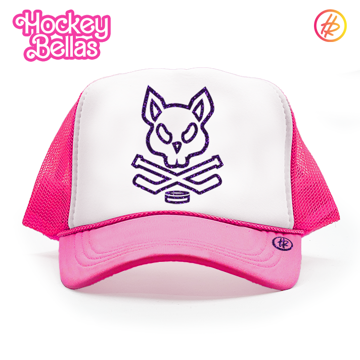 Rock the rink with the Hockey Bellas in this Neon Pink YOUTH SIZED Foam Front Trucker hat. Inspired by these hockey sisters, this snazzy foam front trucker hat features the Hatty Ratty™ rink rat logo in purple glitter. With your purchase, 20% of sales are donated back to the Hockey Bellas non-profit Pucks for Pups. What a real hat-trick!