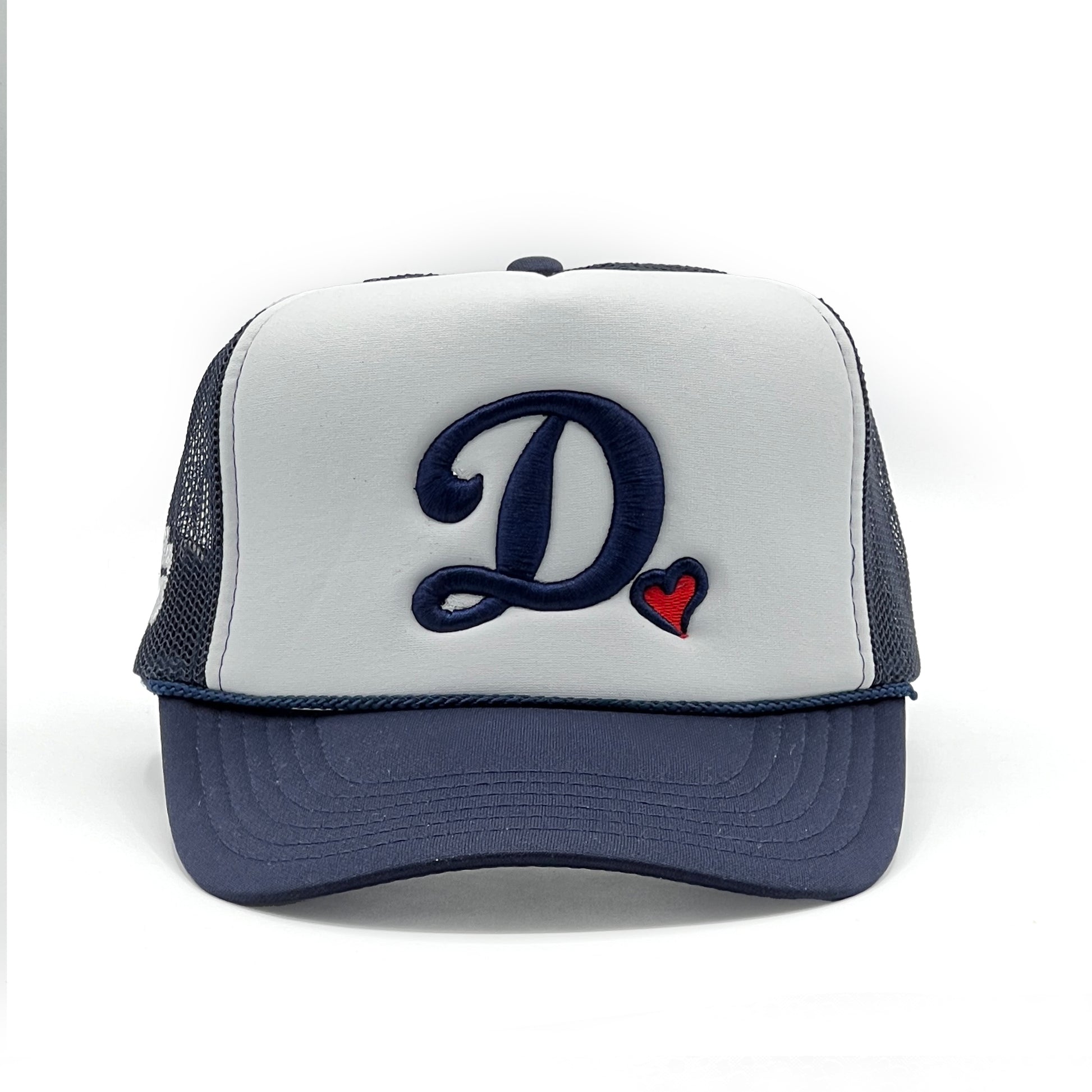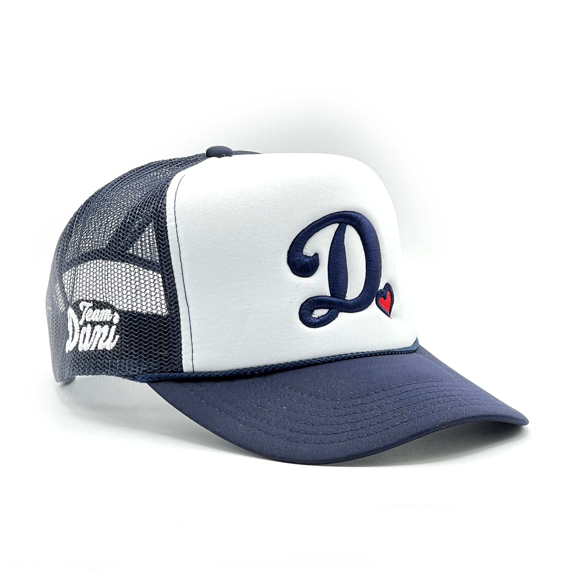 This ICONIC foam front hat features an embroidered cursive D with heart at the front and Team Dani on the right side.